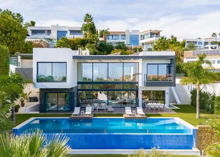 Dotata di una terrazza con vista sul mare, la Villa Michaela Moderna De Super Lujo Con Piscina Y Vistas si trova a 53 minuti di auto dall'aeroporto di Malaga. Gli ospiti possono praticare windsurf, snorkeling e canottaggio presso questa villa, situata a circa 2 km dalla Chiesa di San Pedro.